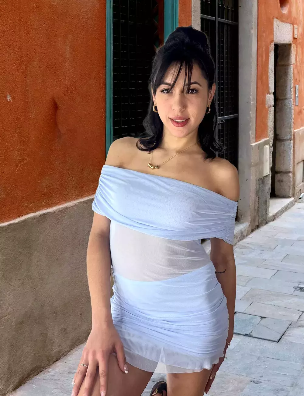 ✨ Vestido corto en tono rosa pastel y celeste ,con diseño off-shoulder que resalta los hombros de manera elegante y femenina. El tejido con efecto drapeado en la parte superior e inferior estiliza la figura, mientras que el corte ajustado aporta un aire sofisticado y sensual. Complementado con sandalias blancas de tacón y bolso pequeño, es un look perfecto para eventos de día o de noche donde quieras destacar con frescura y glamour. 🌸💖